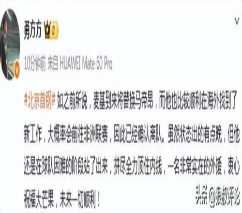 北京时间3月5日,根据媒体人“勇方方”的报道,麦基到来将替换马帝昂,而他也比较顺利在海外找到了新工作,大概率会前往非洲联赛,因此已经确认离队。虽然状态出的有点晚,但他还是在球队困难的阶段站了出来,拼尽全力顶住内线,一名非常实在的外援,衷心祝福大芒果,未来一切顺利! 。