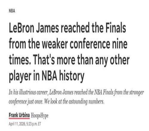 詹姆斯值得所有赞誉,但我们近期研究发现,他通往总决赛的路径呈现出一个有趣的规律:10次总决赛之旅中,这位天选之子有9次是从实力更弱的分区突围。顺带一提,这一数字同样是NBA历史之最,也意味着詹姆斯整个职业生涯仅1次从更强分区打进总决赛。那次例外发生在2019-20赛季,他带领洛杉矶湖人闯入总决赛。