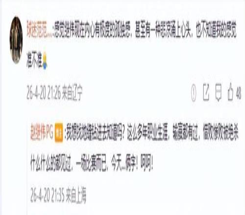 赛后赵继伟发文“呵呵”让大家有些误会,之后赵继伟解释表示:我想找地缝钻进去知道吗?这么多年职业生涯,输赢都有过,惜败惨败被绝杀什么什么的都见过,一场比赛而已,今天…俩字!呵呵!