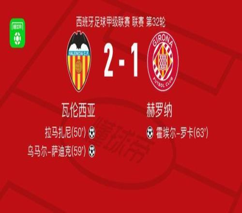北京时间4月26日西班牙足球甲级联赛 联赛 第32轮,瓦伦西亚主场对阵赫罗纳。瓦伦西亚拉马扎尼破门,乌马尔-萨迪克破门。赫罗纳霍埃尔-罗卡破门。最终比分瓦伦西亚 2-1 赫罗纳。
