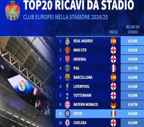 北京时间2月17日,德转统计出2024-25赛季欧洲球场门票收入最高的20家俱乐部,皇家马德里以2.33亿欧元高居第一,曼联1.91亿欧元第二,阿森纳1.83亿欧元第三。德转统计2024-25赛季欧